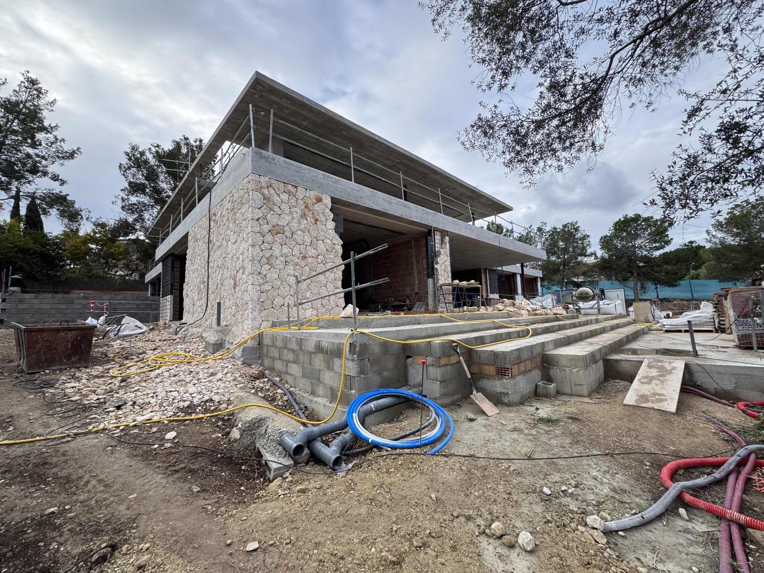 Hemos cuidado cada detalle en la construcción para que mantenga la condición de vivienda de alto standing. La estructura de hormigón garantiza solidez y durabilidad, complementada con un eficiente aislamiento exterior. Los techos de hormigón visto aportan un toque de elegancia industrial, mientras que la carpintería minimalista favorece la entrada de luz natural a través de los grandes ventanales de piedra, integrando el interior con el entorno. Para el máximo confort, se ha instalado suelo radiante y un sistema de aerotermia. Los forros de piedra exterior realzan la belleza y singularidad de la propiedad.